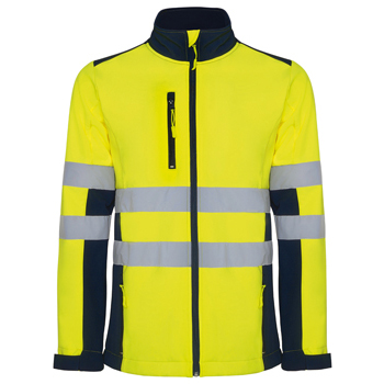 Soft shell bicolore ad alta visibilità. · Bande riflettenti sul petto e sulla manica. · Collo alto, cerniera centrale. · Velcro di chiusura sui polsini. · Elastico interno nel girovita con coulisse di chiusura. · Tre tasche esterne e due interne.