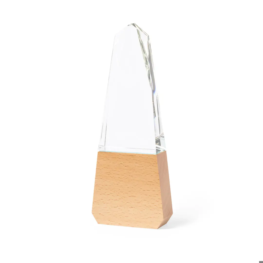 Trofeo in vetro spesso e resistente, con base in legno naturale. Presentato in una custodia protettiva kraft, con chiusura magnetica e schiuma interna.