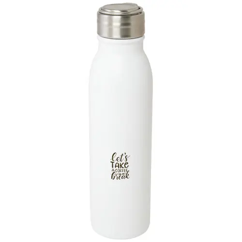 Borraccia a parete singola in acciaio inox certificato RCS, con coperchio ermetico a vite e un resistente anello in lega di zinco per trasportarla. Senza BPA, testata e approvata secondo la legislazione tedesca sulla sicurezza alimentare (LFGB). Testata e approvata per il contenuto di ftalati secondo il regolamento REACH. Si adatta alla maggior parte dei porta bibita standard per auto. Capacità di 700ml. È consigliato lavarla a mano. Fornita in una confezione regalo in cartone riciclato.