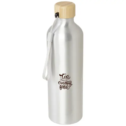 Borraccia in alluminio riciclato certificato RCS con un elegante coperchio in bambù. Questa borraccia leggera e a parete singola è dotata di un cinturino che ne facilita il trasporto. Il bambù proviene da fonti sostenibili, responsabili dal punto di vista ambientale e sociale. Capacità: 770 ml. Lavarla solo a mano.