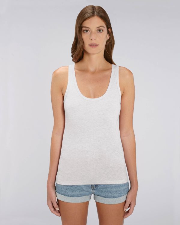 La canotta da donna Stella Dreamer è realizzata al 100% in cotone biologico filato e pettinato per garantire comfort e morbidezza. Disponibile in diverse taglie, questa canotta aderente con girocollo e giromanica con sbieco a costine 1x1 è l'ideale per look casual e comodi. La fettuccia di rinforzo sull'interno collo e la doppia impuntura stretta sul bordo inferiore assicurano anche una maggiore resistenza nel tempo. Personalizzabile con la stampa del tuo logo grazie a tecniche come la serigrafia, il ricamo, il vinile e il trasferimento. Rendi unica la tua canotta e mostrati trendy e attenta all'ambiente. Senza maniche