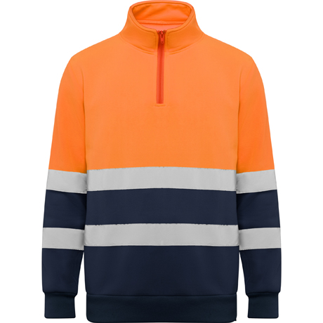 Felpa alta visibilità con zip di misura. · Collo alto con mentoniera e puller. · Due bande rifrangenti orizzontali su busto e maniche. · Cuciture di copertura rinforzate all'interno del collo. · Costine 1x1 su polsini e orlo.