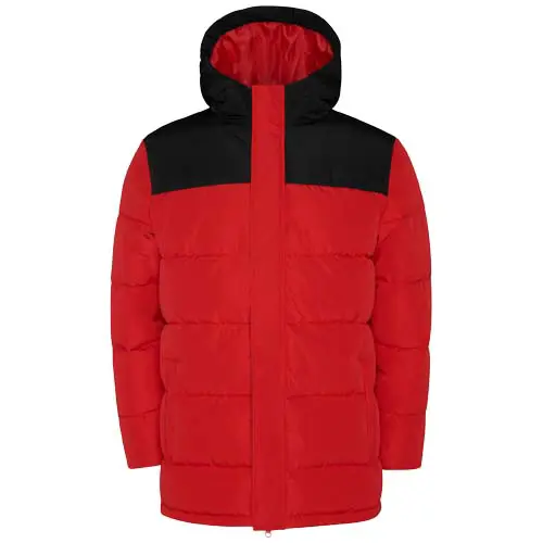 Giacca imbottita con cappuccio fisso. Cerniera anteriore coperta da una pattina. Proteggi mento. Due tasche laterali con zip. Polsini elasticizzati.