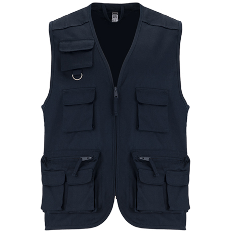 Gilet da lavoro multitasche con collo a V. · Cerniera centrale con tiretto. · Tre tasche sul petto con pattina e chiusura a velcro. · Tasca superiore con anello multifunzione. · Due tasche laterali con cerniera e tiretto, con due tasche sovrapposte con pattina e chiusura a velcro. · Due tasche posteriori con pattina e chiusura a velcro. · Collo, giromanica e orlo con bordatura.