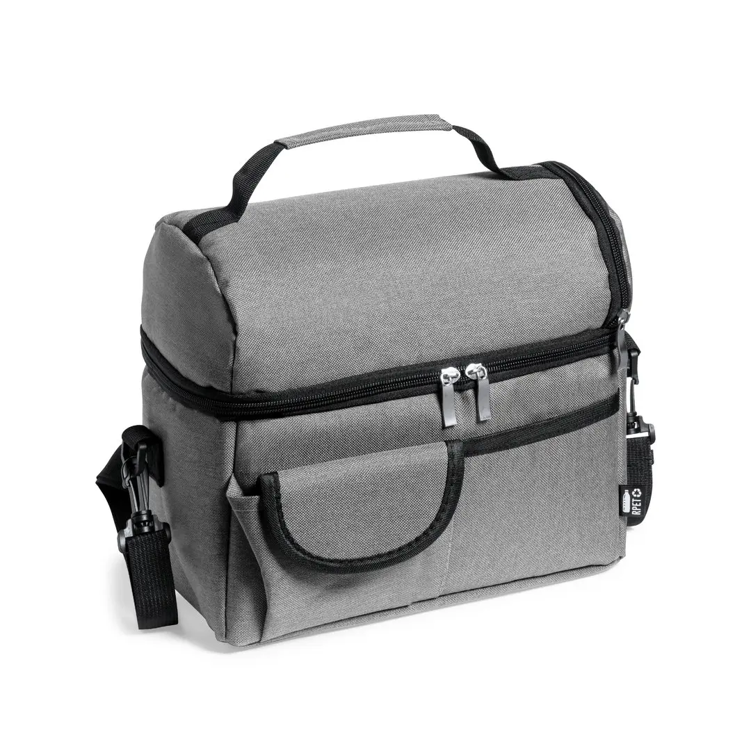 Borsa termica realizzata in resistente RPET 600D. Include 2 scomparti separati, con chiusura a zip e manici in metallo. Interno isotermico in PEVA con tracolla regolabile e imbottitura a spalla coordinata. Tasca posteriore in rete elasticizzata e due tasche anteriori, di cui una con chiusura a velcro. Etichetta esterna con logo RPET, disponibile in diversi colori. .Il materiale RPET è realizzato con plastica riciclata per incoraggiare il riutilizzo dei rifiuti plastici e contribuire alla sostenibilità del pianeta.