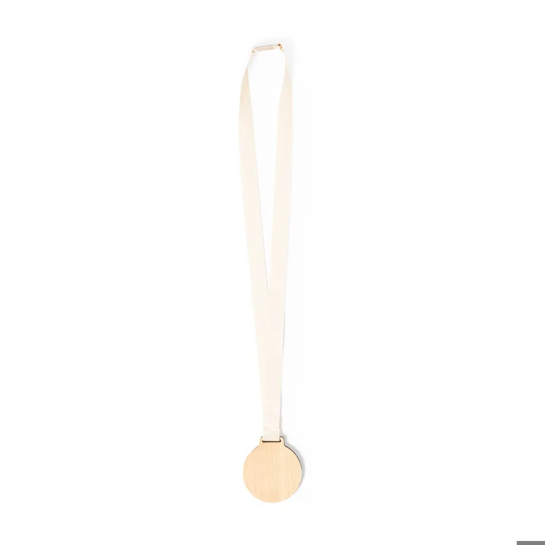 Medaglia della linea natura in legno naturale. Cordino in 100% cotone, con chiusura di sicurezza al collo in fibra di grano.