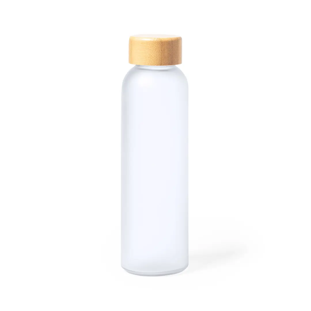 Borraccia della linea natura da 500 ml, appositamente realizzata per la stampa in sublimazione. Corpo in vetro, con tappo a vite in bambù e BPA free. Presentato in una scatola individuale dal design ecologico.