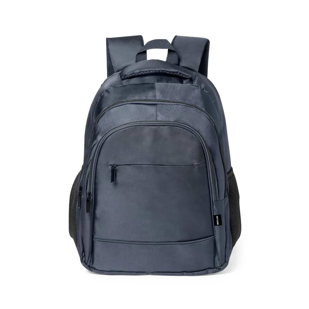 Zaino di alta qualità realizzato in RNYLON 420D. Scomparto principale con chiusura a zip in tinta e doppio tiretto. Include 3 tasche esterne con cerniera e 2 tasche laterali in rete. Imbottitura su maniglia, schienale e spallacci, che sono anche regolabili. Interno con scomparto imbottito per laptop fino a 15" e supporto posteriore per trolley. Disponibile in una vasta gamma di colori, con etichetta riciclata allesterno.Il materiale RNYLON è realizzato con plastica riciclata per incoraggiare il riutilizzo dei rifiuti plastici e contribuire alla sostenibilità del pianeta.