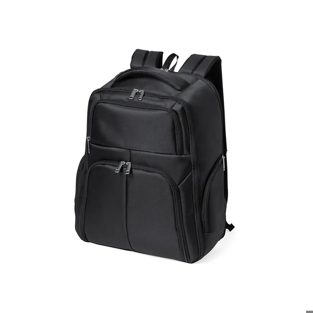 Zaino di alta qualità realizzato in resistente Nyon 600D con finitura nera. Scomparto principale con chiusura a zip in tinta e doppio tiretto. Include 3 tasche esterne e 2 tasche laterali, tutte con chiusura a zip. Maniglia, schienale e spallacci imbottiti, che sono anche regolabili. Interno con scomparti imbottiti per laptop fino a 17" e tablet fino a 12". Supporto posteriore per la sistemazione su trolley.