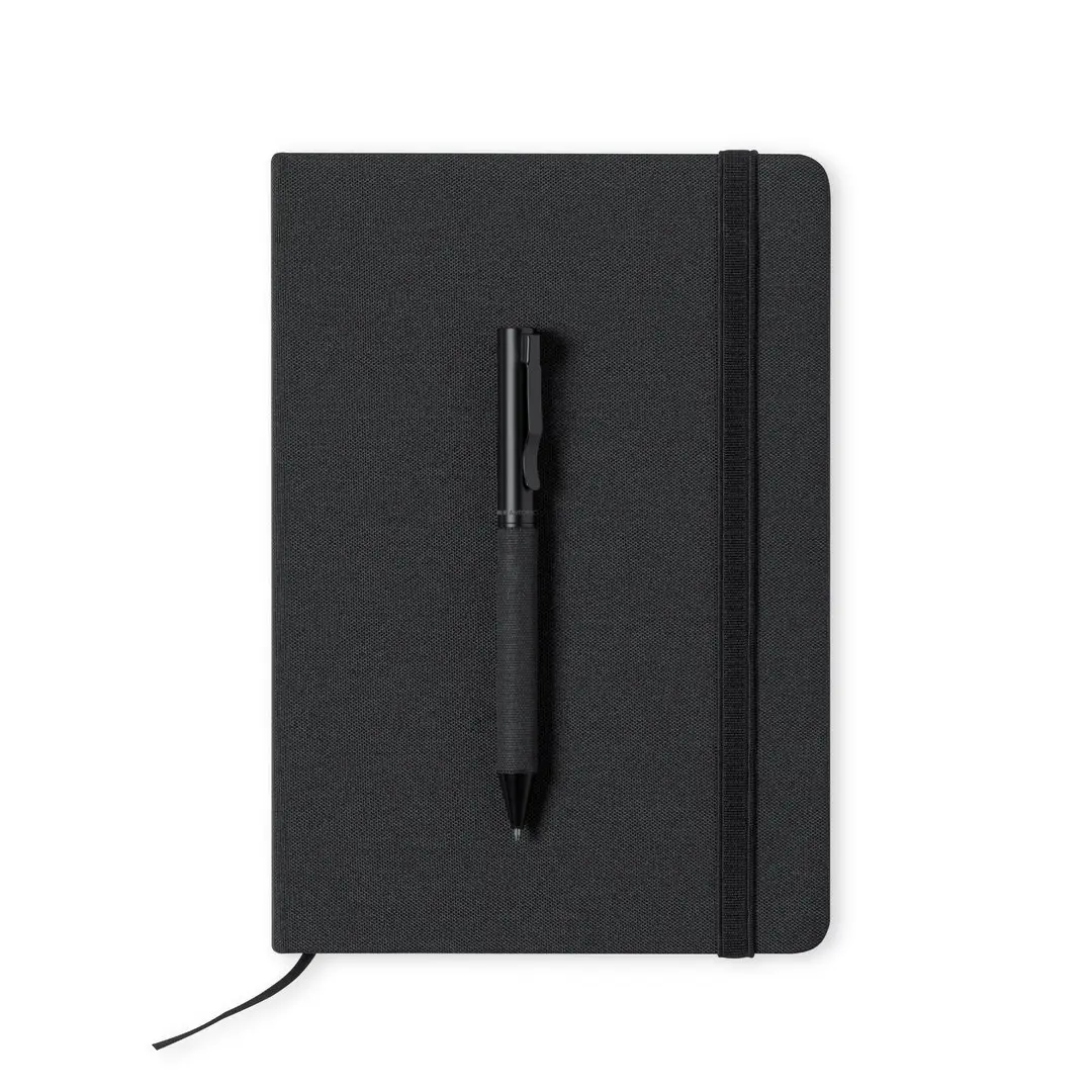 Set di block notes e penna di Antonio Miró. Include: .Block notes con elegante finitura nera, realizzato in resistente poliestere 300D, con copertina rigida e chiusura elastica abbinata. Interno con 100 fogli dal layout a righe singole.Penna a rotazione in metallo con inchiostro blu. Con fusto e finiture nere, clip in metallo e logo del marchio.Il set è confezionato in unelegante e robusta scatola nera con logo Antonio Miró e custodia protettiva abbinata.