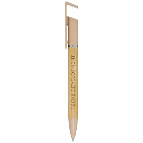 Penna a sfera in bambù che funge anche da supporto per smartphone. Il pulsante e l'anello centrale sono in plastica riciclata, la punta è in ottone e il fusto è in bambù proveniente da fonti responsabili. Colore dell'inchiostro: Nero. Capacità di scrittura: 1000 metri. Dimensione del pennino: 1,0 mm.