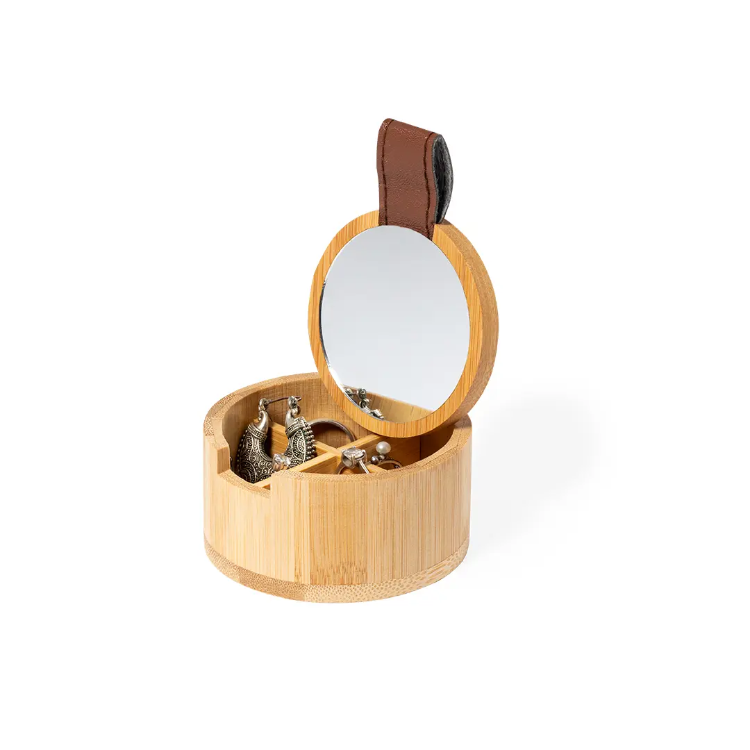 Il porta gioie Fontana è il complemento ideale per chi ama la natura e cerca un'idea originale per la propria camera da letto. Realizzato in bambù, è molto resistente e presenta 4 scomparti interni per organizzare al meglio i propri tesori. Il coperchio è dotato di una maniglia in PU ed un pratico specchio 1X dal diametro di 6 cm. La pellicola protettiva previene graffi e danni durante il trasporto e la scatola individuale di design ecologico è perfetta per essere regalata. Personalizza il tuo Portagioie Fontana con il logo della tua azienda per fare pubblicità durante eventi e fiere. Scopri i benefici di questo pratico prodotto promozionale oggi stesso!