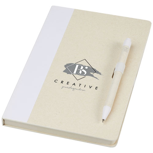 Set composto da blocco note in formato A5 e penna a sfera. Il blocco note presenta 80 fogli a righe (80 g/m²) realizzati con cartoni del latte riciclati (fino al 70%), con dorso in carta colorata e un portapenne. Il portapenne contiene penna a sfera con meccanismo a scatto abbinata al colore del blocco note. La penna ha un fusto realizzato con lo stesso materiale del cartone del latte riciclato e il pulsante, la clip e la punta sono in plastica PLA colorata. La penna è dotata di una ricarica di inchiostro nero all'interno. I cartoni del latte usati vengono raccolti, selezionati, lavorati e trasformati in carta, trasformando un semplice rifiuto in qualcosa di utile.
