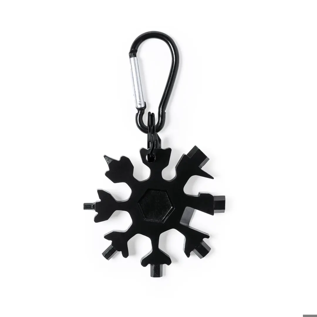 Originale e pratico multiutensile in robusto acciaio inox con finitura nera, con anello di trasporto e moschettone abbinati. Con 17 funzioni, tra cui cacciavite piatto e a croce; chiavi esagonali a brugola; coltello e apribottiglie. Confezionato singolarmente in una scatola nera.