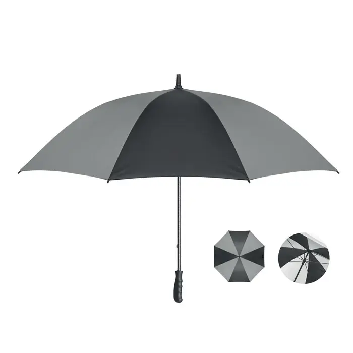 Ombrello dritto da 23 pollici in POE con piping e 1 pannello in poliestere per la stampa. Apertura manuale. Stecche e telaio in fibra di vetro. Asta cromata con punte in plastica. Manico rifinito in gomma.