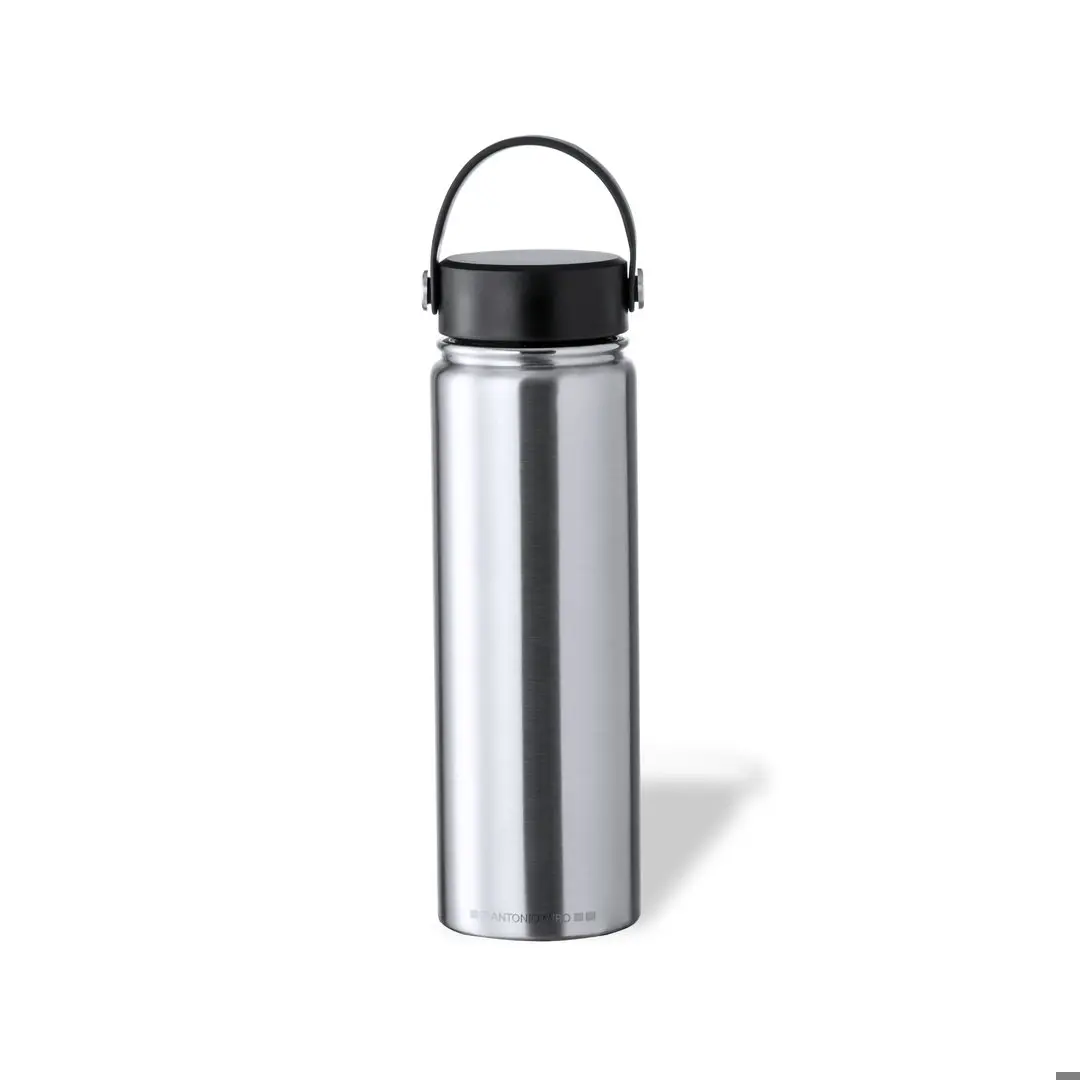 Borraccia termica Antonio Miró con capacità di 650 ml. In acciaio inox a doppia parete con finitura satinata. Con tappo a vite nero e tracolla in silicone abbinata. Con logo Antonio Miró sul corpo e presentata in una scatola nera individuale con logo del marchio.